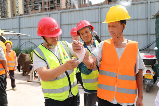 啟動儀式結(jié)束后,項(xiàng)目部工作人員迅速開展聯(lián)合應(yīng)急演練,模擬火災(zāi)、高處墜落等工地典型突發(fā)場景。演練中,現(xiàn)場示范滅火器的操作規(guī)范,講解使用要點(diǎn),并組織人員進(jìn)行實(shí)操訓(xùn)練,確保人人掌握滅火技能;隨后開展急救包扎演示教學(xué),切實(shí)提升人員應(yīng)急救護(hù)技能。